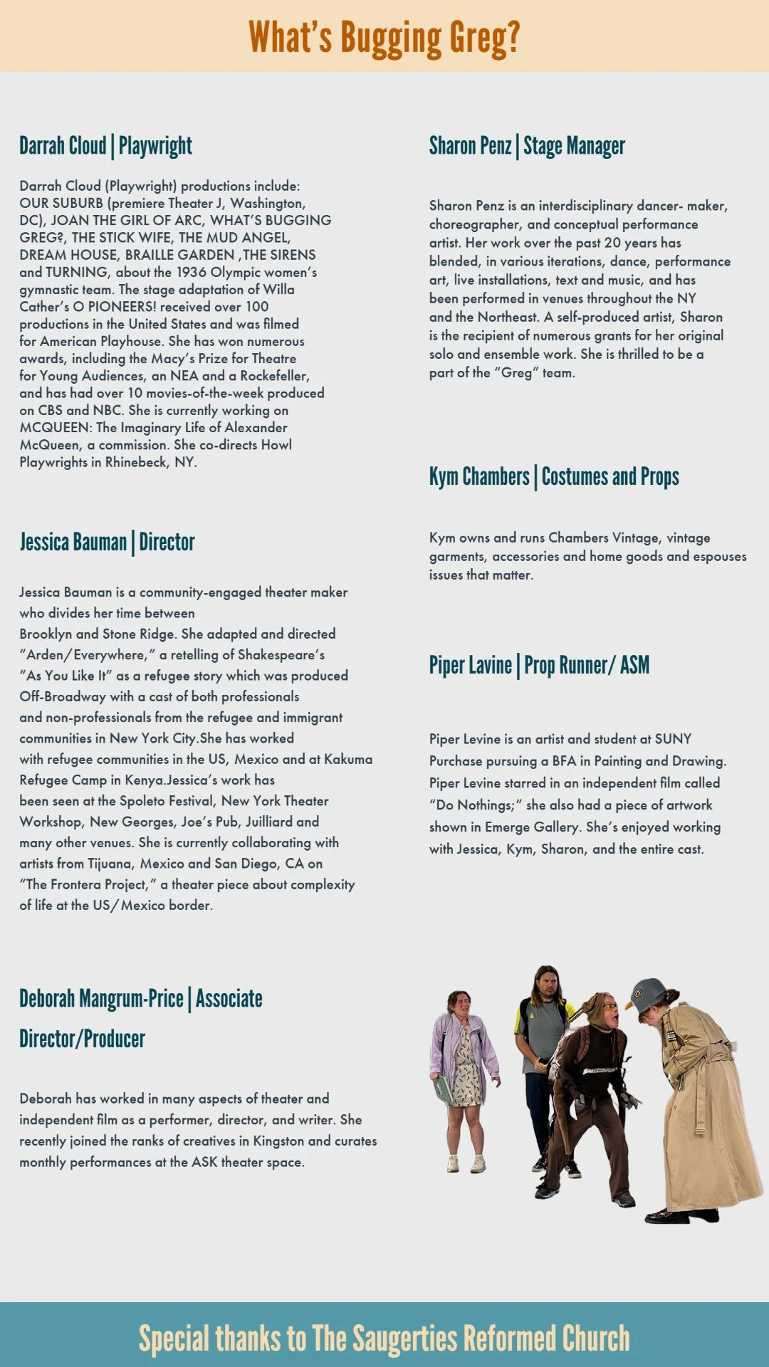 Costumes and props: Kym Chambers. Kym owns and runs Chambers Vintage, Saugerties.